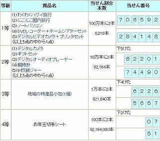 寒さとの予報が。。。残念!今年のお年玉付き年賀葉書の当選番号を 調べたら 4等の切手シートがたったの2枚 しか当たっていなかった。 去年は切手シートが6枚だった。 世の中には運のいい人がいるものだと驚いた。 富山市の新婚夫婦堀井さんに届いた お年玉付き年賀はがき二十枚の中から 一等が二枚も当たったんだって。。。 たった20枚から1等が2本も当たるなんて あり得ない確立と驚いた。いいなぁ〜(笑) |