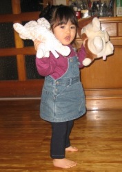 運動能力に比べて 言葉が遅い有佳里だけど お名前は?と聞くと「たしろ あかり」と答える様になった。 「あかりのコップ」とか「あかりも」とか言っていたので自分は あかりという名前だと分かっているんだと思っていた。 美映が「たしろあかり」と言えるようになったよと 云うので 「お名前は」と聞いてみた。その時は はっきりと「たしろあかり」 と言っていたのだけど デジカメでビデオを撮ると「たしろ」が ちょと〜〜(笑) 言える時と言えない時があるんだね。 ついでに「いくつですか?」と聞いてみたら指1本を出した。 自分は2歳で指2本を出さなきゃと分かっているみたいで 一生懸命 2本を立てようとするけど出来ないので 逃げていってしまった。(笑) そのビデオはここ 貞治と美映は言葉が遅かった。自分の事を貞治は「めーたん」と言い 美映は「たっち」と言っていた。 貞治は2階の窓から よく「めーたん ここよ」と大きな声で自分をアピールしていた(笑) 美映は小学生位までニックネームで「たっち」と呼ばれていたな〜と懐かしく思い出した。 有佳里は自分の事を「あかり」と言えるなんてすごいね(笑) 婆々バカ発揮!(笑) |